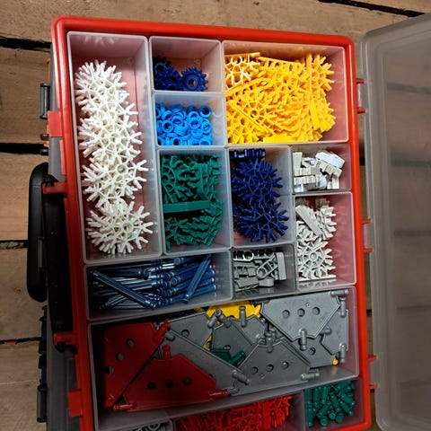 K'NEX byggesæt med forskellige plastikdele til konstruktion af modeller. Indeholder mange farvede stænger og forbindelsesdele, som kan samles til forskellige strukturer og bevægelige modeller.