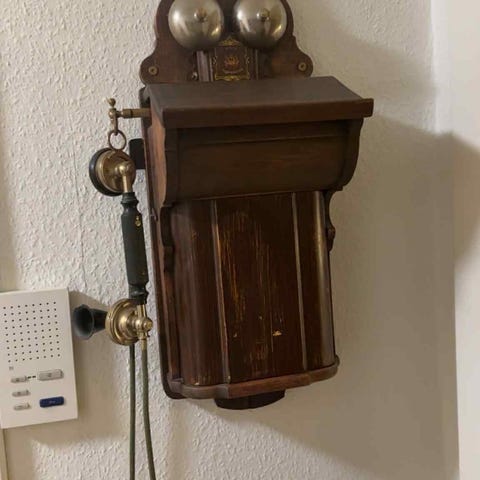 Antik trætelefon vægtelefon med håndsving og messingdetaljer. Telefonen er udført i mørkt træ og har en klassisk gammeldags design. Den har en vægmonteret konstruktion med en åben klap til opbevaring eller adgang til telefonens indre. Telefonen er udstyret med en gammeldags håndsving og en gammeldags modtager med en sort gummikapsel. Velegnet som dekorativt element eller samlerobjekt.