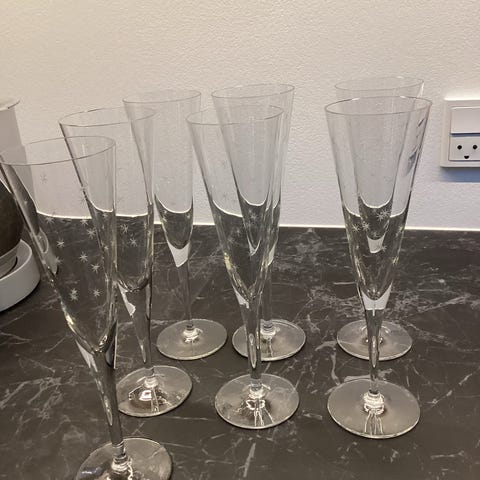 IKEA champagneglas i klart glas. Glasene har en slank form med stilk og fod, velegnet til servering af champagne eller mousserende vin. Har 11 stk. Næsten ikke brugt og helt som ny uden tegn på brug.