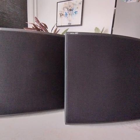 Højttalerne har været brugt i et surround setop og spiller fremragende. Den ene mangler frontstof, men spiller fint. Pr. stk kr.400 samlet kr. 1900