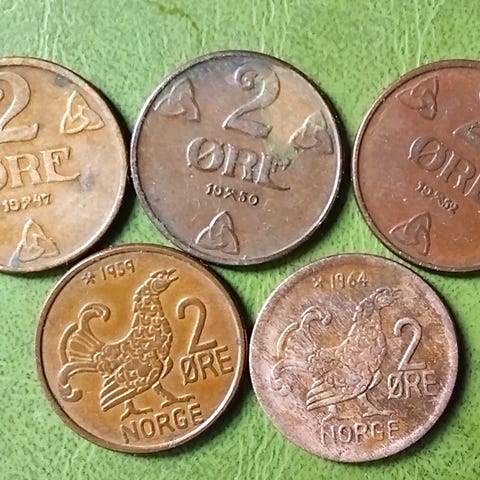 NORGE NORWAY 1 ØRE 1936, 1937, 1948, 1950, 1953, 1955, 1956, 1957, 1962 3 SLAGS! Prisen er for dem alle! Porto 25kr. op til 100gram!