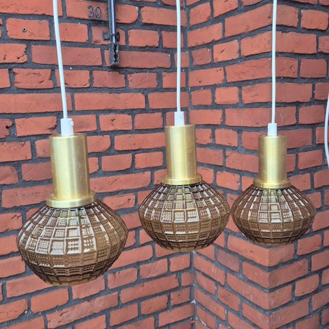 Lamperne har minimale brugsspor og er uden afslag, revner og skår i glasset. De er 18 cm høje, har en diameter på 12 cm og er med nye ledninger på over to meter klar til at blive hængt op.