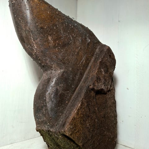 Fugle skulptur fremstillet af sten med en abstrakt form. Skulpturen har en glat overflade og en mørk farvetone med naturlige variationer i materialet. Velegnet som dekorativt element i hjem eller kontor.