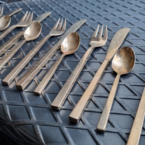 Bestiksættet består af 12 sæt af 5 dele. Kniv og gaffel, stor og lille ske og teske. Derudover 4 serveringsskeer
