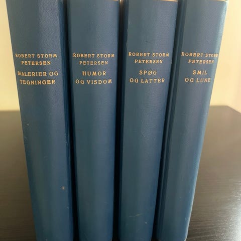 Robert Storm Petersen bøger sæt med læderindbinding. Sættet består af tre bind med detaljeret rygdesign og guldsnit på siderne. “Malerier og tegninger” “Humor og Visdom” og “Episoder og hændelser” udgivet af C. A. F. Samlet pris. Se mine øvrige annoncer for mange spændende ting.