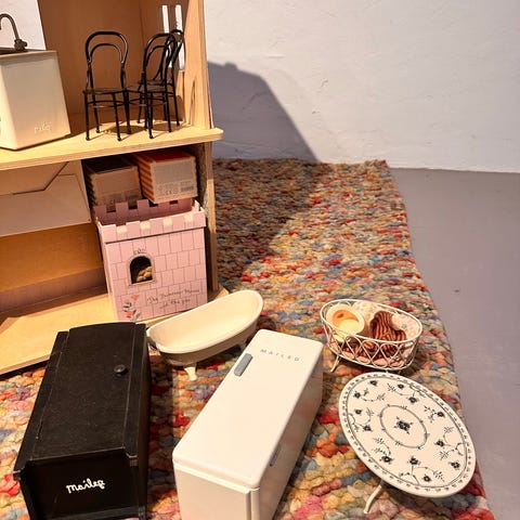 3-etages dukkehus, højde - 71 cm, bredde - 60 cm, dybde - 39 cm. Lavet af træ. Med, trapper, vinduer, døre og altaner. Som ny. En kasse med møbler, dukker og tilbehør kommer med. 3+ Afhentes på Amager.
