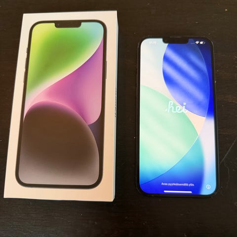 Apple iPhone 14 Plus mobiltelefon med 128 GB lagerplads. Enheden har en sort farve.. Telefonen har brugsspor på skærmen (2 revner.) som fremgår af billederne.