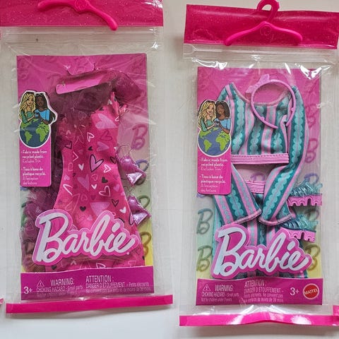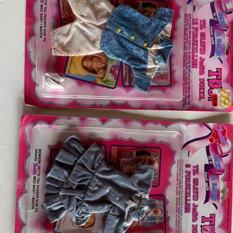 Barbie Baby Sitter børnetøj sæt bestående af en orange og hvid stribet top med tekst og grå bukser. Sættet er designet til collecters