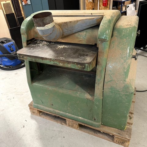 Afretter tykkelseshøvl 45 cm fabrikat Jens Andersen Otterup. U- opslidelig støbejern. Medfølger et ekstra sæt jern samt nøgle til kutteren.