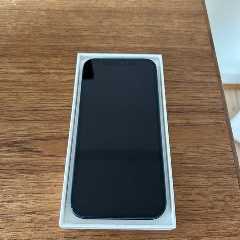 Apple iPhone 12 smartphone med 64 GB lagerplads i blå farve. Enheden har en skærm med notch og dobbeltkamera på bagsiden. Telefonen har knapper til lydstyrke og mute på siden.