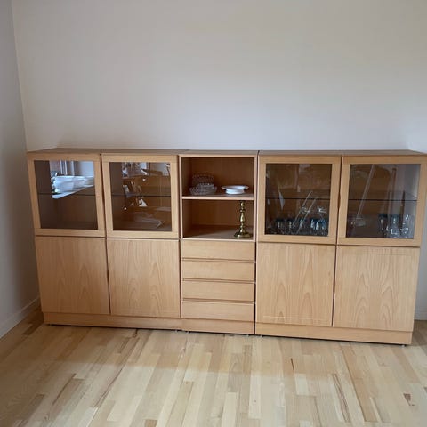 Flot og tidløs skænk fra Klim i eg. Skænken har to skabe samt åbent midterrum med hylde, velegnet til opbevaring af service, bøger eller elektronik. Står på elegante, slanke ben og fremstår i pæn, brugt stand med almindelige brugsspor.