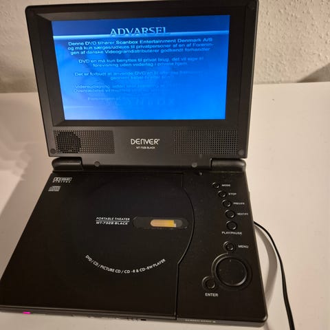 Bærbar DVD-afspiller med indbygget skærm, fjernbetjening og tilbehør som opbevaringsetui og bærepose. Enheden er designet til mobil brug og afspilning af DVD-film. Perfekt til bilturen.