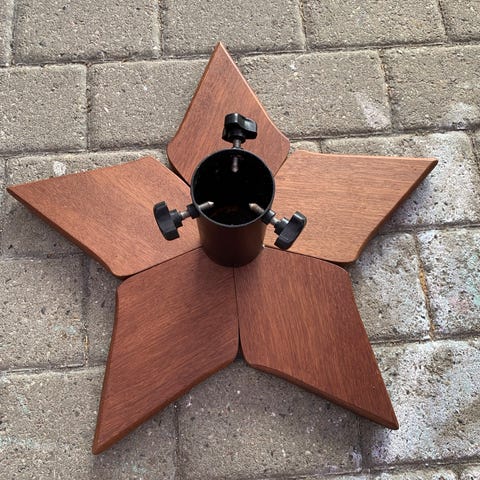 Denne smukke juletræsfod er lavet af lyst træ og metal, hvilket giver den et elegant og tidløst udseende. De små skruer på træfoden sørger for, at dit juletræ står sikkert og stabilt.