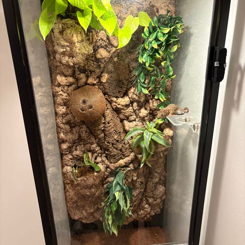 Han bor i et hjemmelavet terrarie lavet ud af en gammel kommode. Den er hvid. Han har selvfølgelig uv og uvb som han kræver .