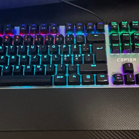 Sælger et Cepter gaming tastatur med blå clicky mekaniske switches. Tasterne kan tages af og udskiftes.