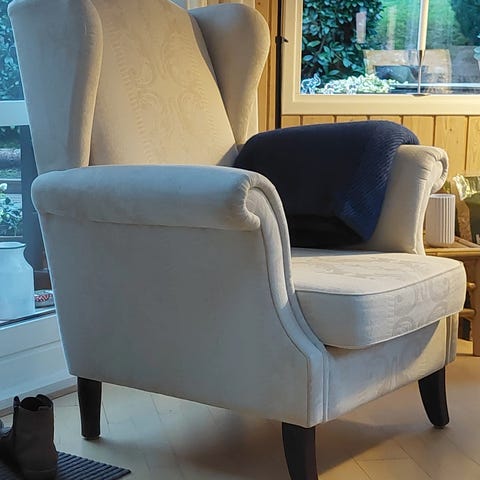 Lænestol i beige stof med polstret sæde og ryg. Stolen har træben og armlæn med rullede ender. Velegnet til stue eller opholdsrum.