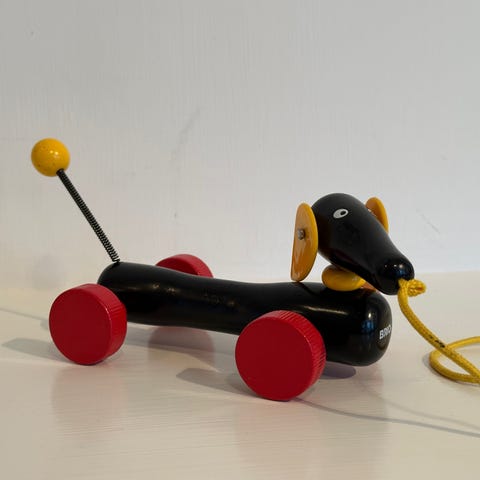 BRIO Dachshund trælegetøj til børn. Legetøjet er lavet af træ og formet som en gravhund med hjul, der kan trækkes. Designet til børn fra 12 måneder og opefter.