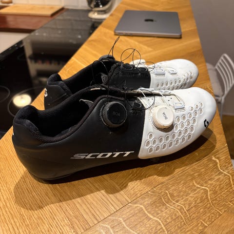 Fine Scott Road RC Evo Landevejssko i str. 42 med carbonsål. De glæder sig til en ny ejermand, der vil tage dem ud på landevejene :-)
