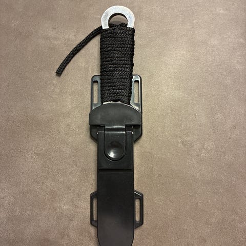ScubaPro SK-21, rustfri, hylster med lås, gummiremme med kliklås, 12 cm, grå, næsten som ny. Nypris ca. 570,-