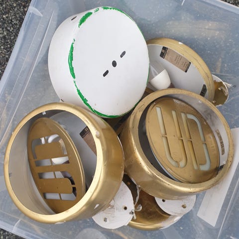 Vilhelm Lauritzen for Louis Poulsen, UD-lampe/ skilt af messing.Desværre er glas flækket så det trænger til reparation .