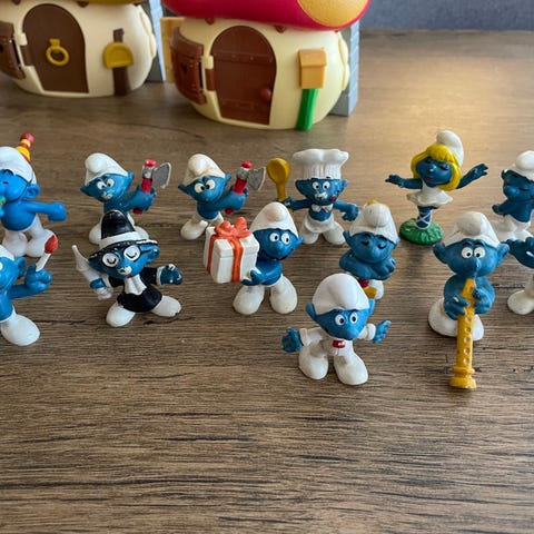 Nogle af smølferne mangler dele og er knækket og har slid. (Se billederne)