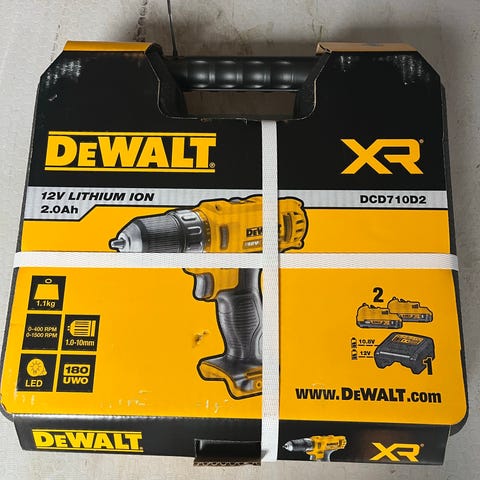 DeWalt DCD800P2T XR boremaskine sæt med to batterier, oplader og tilbehør i en opbevaringskasse. Sættet inkluderer en boremaskine, batterier, oplader og ekstraudstyr, egnet til forskellige boreopgaver. Ikke brugt helt nyt stadig garanti