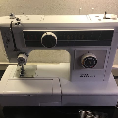 Eva Royal 3800 symaskine. Virker fint. Der medfølger fodpedal, trådholder, ekstra nåle, mm. (ses på sidste billede).