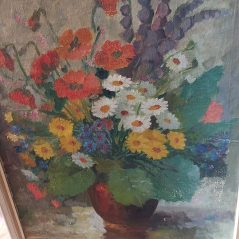 Edith Gert olie på lærred maleri, motiv af blomster i en vase. Fin stand.