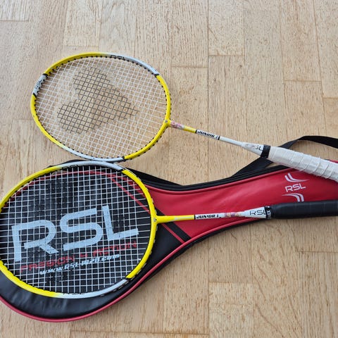 Trivitt racket sæt indeholdende to ketchere med sort og orange farvet design. Sættet inkluderer desuden en taske til opbevaring, en dåse shuttles og træningsudstyr bestående af orange kogler og en grå træningsbold.