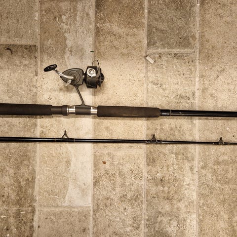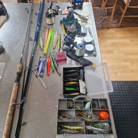 Fiskesæt, Komplet til pilkning incl. forfang og pilk - klar til en tur på havet. Hjul og stang i god stand og monteret med kraftig nylonline.