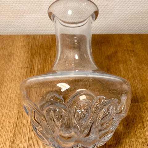 bowle / flaske transparent glas. Holmegaard signeret HG7 P (Holmegaard Glasværk 1977 Per Lütken). På ståfladen lidt brugsspor. Smuk karaffel 17 cm høj, diameter foroven 12 cm, på det tykkeste sted er den 19,5 cm. Vægt 1,160 kg.