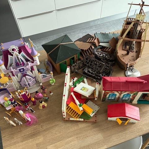 Playmobil legetøjssæt med forskellige figurer, dyr og tilbehør. Sættet inkluderer møbler, hegn, køretøjer og diverse småting i farverig plastik. Egnet til børn til leg og rollelege.
