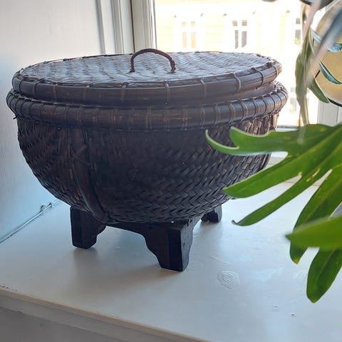 Det her er en stor håndflettet kurv/skål i naturfiber, meget typisk vestafrikansk (Ghana / Burkina Faso) eller muligvis Nordafrika, flettet i elefantgræs / søgræs / raffia, med sort indfarvet bindemateriale og to kraftige hanke.