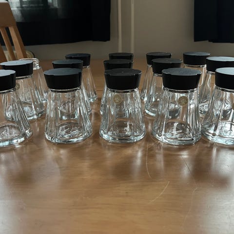 Rosendahl krydderiglas bestående af 12 glas med sorte låg og et kværn låg (aldrig brugt). Glassene er enten ubrugte eller sparsomt brugt uden tegn på brug.