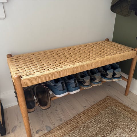 Fordele ved skobænk med opbevaringGør din entré indbydende og ryddelig med denne skobænk med pude. Sæt dig behageligt, når skoene skal af og på, og nyd et stabilt møbel med en max. statisk bæreevne på 150 kg. Den aftagelige betræk i linned-look er nem at rengøre, og de 10 rum giver overblik over hverdagens sko og småting.Fleksibel skoreol til hele familienDe 30 cm dybe rum passer til sko op til størrelse 44. Sidefagenes skilleplader kan fjernes eller justeres, så der også er plads til støvler og højere fodtøj. Puden er fastgjort med burrebånd og kan tages af, hvis du vil bruge møblet lodret som en praktisk opbevaringsreol til bøger, dekorationer eller legetøj.Enkel stil i egDet tidløse design i egfarve passer smukt i entré, garderobe eller soveværelse. Robust E1-spånplade og skumfyldt sædepude giver komfort og holdbarhed i hverdagen.Komfortabel siddeplads med aftagelig pude i linned-look10 rum – plads til sko op til str. 44Fleksible sidefag med justerbare/aftagelige skillepladerKan bruges vandret som bænk eller lodret som reolSolid konstruktion i E1-spånplade, bæreevne 150 kgProdukt: Skobænk/skoreol med pudeFarve: EgMateriale, korpus: E1-spånpladePudefyld: SkumBetræk: Stof med linned-lookMål (L × B × H): 104 × 30 × 48 cmAntal rum: 10Maks. statisk belastning: 150 kgVægt: 20,8 kgIndeholder: 1 skobænk, tilbehørssæt, vejledning