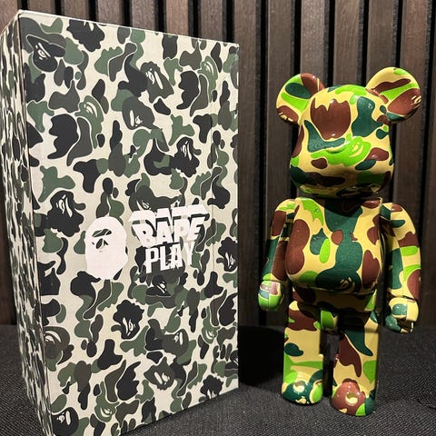 BAPE play Bearbrick 200% camouflage figur. Fremstillet i plast med camouflagefarvet design. Samlerobjekt med detaljer inspireret af A Bathing Ape-mærket.