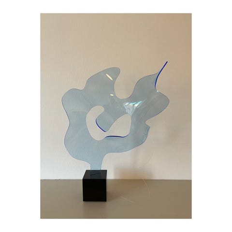 Elegant og poetisk akrylskulptur udført i transparent, matteret akryl med fine blå konturer, der fremhæver værkets organiske og svævende former. Skulpturen fremstår let og næsten vægtløs, hvor lyset spiller smukt i materialet og skaber subtile refleksioner og dybde afhængigt af betragterens vinkel.