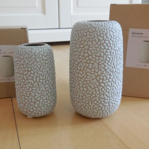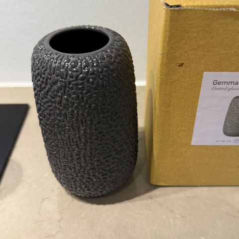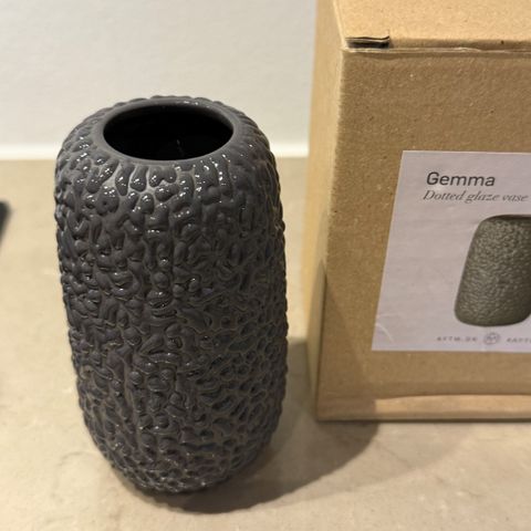 Ny Gemma vase i original emballage. Firmagave. Den er 10 cm høj. Flot grå farve, der spiller i lyset. Sender gerne