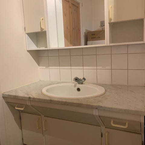 Hvid oval vask inkl. blandingsbatteri integreret i en marmorbordplade, som er monteret på et badeværelsesmøbel med hvide skabe og skuffer. Spejl med lys og skabe medfølger også.