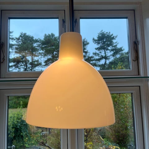 Den passer godt til at hænge over spisebordet, og det gør den fordi, den har en elliptisk skærm på, som giver et behageligt nedadgående lys. Indvendigt er skærmen belagt med en mat hvidlakering, som hjælper med at udsende lyset på en koncentreret måde. Og så har den avanceret lysreflektor, som giver et rundsymmetrisk lys og en rar stemning i rummet.