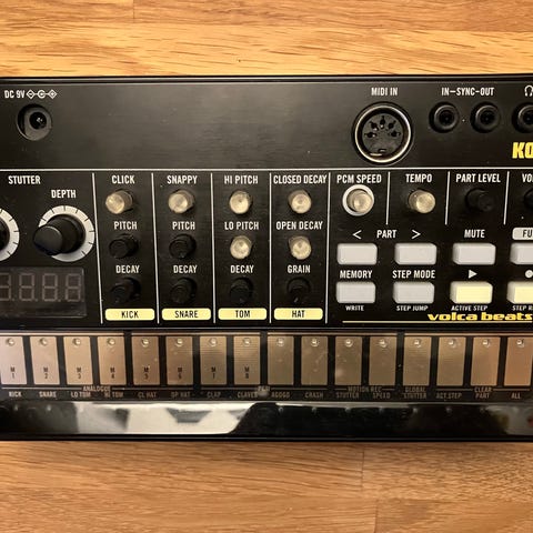 Korg Volca Bass Analog Synthesizer with multiple control knobs, step sequencer, and metal casing. Designed for creating bass sounds with analog circuitry. Compact and portable music instrument suitable for electronic music production.