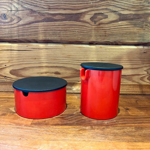 Stelton mælkekande og sukkerskål i rød plast med tilhørende sorte låg.