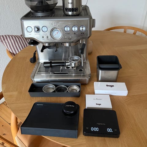 Topmodel Sage Oracle Barista Express espressomaskine i rustfrit stål. Maskinen har indbygget kaffekværn, dampstav til mælkeskumning, digitalt display,