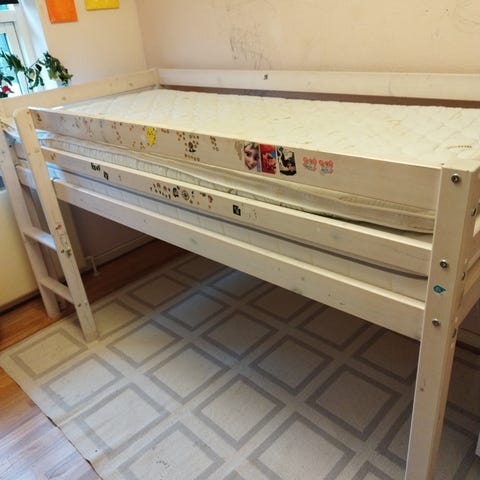 IKEA Højseng til børn, udført i hvidt træ. Sengen er designet med en trappe og gelænder for sikkerhed. Egnet til børneværelser og optager effektivt plads ved at hæve sovepladsen.