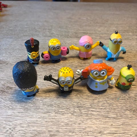 Samling af Minions legetøjsfigurer i forskellige størrelser og designs. Figurenes farver er primært gule med blå tøjdetaljer, og de er lavet af plastikmateriale. Egnet til samlere og børn.