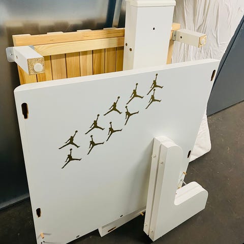 Den er brugt til to børn, sengen kan hæves i to højder og den ene side kan tages af.