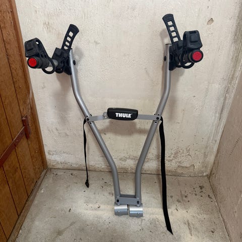 Thule Cykelholder til bil med monteringsdele og lygter. Designet til transport af cykler på bilens bagende. Fremstillet i sort materiale med stropper til fastgørelse af cykler.