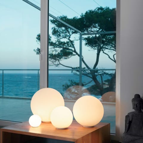 Artemide Dioscuri lampe designet af Michele De Lucchi. Lampen har en rund form og hvid farve. Den er egnet til indendørs brug og leveres med tilslutningskabel.