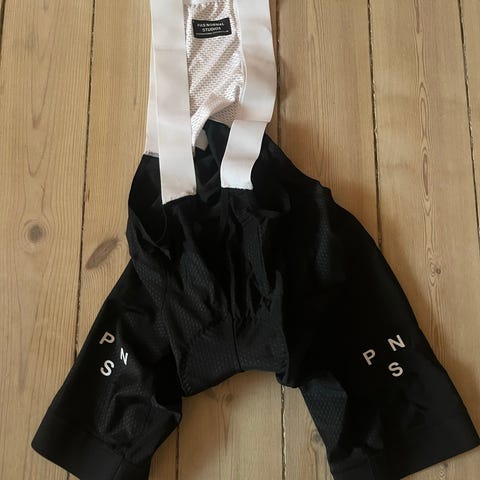 Pas Normal Studios Mechanism Bib Tights i størrelse M. Tightsene er grønne og designet til cykling med seler for bedre pasform og komfort. Materialet er egnet til sportsbrug og giver støtte under aktivitet.