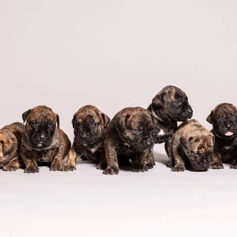 Migle er en stærk, mørkstribet (mørk-brindle) tæve, der nu er 4 uger gammel. Men hvalpene leveres tidligst når de er 8 uger gamle.